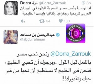 وكانت درة قد غردت وقالت : أنا تونسية وأحب مصر المصرية المؤثرة في الوجدان تاريخياً وجغرافياً وثقافياً وليست الخليجية .