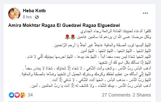 طالبت أميرة مختار ابنه الفنانة رجاء الجداوى، من كل محبيها تكثيف الدعاء لوالدتها بالشفاء العاجل من فيروس كورونا و أن تتحسن حالتها لانها مازالت في الرعاية المركزة ، وانهالت الدعوات من كل متابعيها متمنين لها الشفاء في أقرب وقت ممكن وأن تتحسن حالتها سريعا.