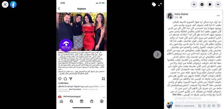 تداول عدد كبير من رواد مواقع التواصل الاجتماعي، أول تعليق لهالة العتال ، طليقة المخرج طارق العريان الأولى ، على المنشور الذي كتبته الفنانة أصالة، تعليقًا على صورته مع عارضة الأزياء السورية نيكول سعفان، والتي يتردد اسمها منذ فترة بالإشارة إلى وجود ارتباط يجمعها بطارق.