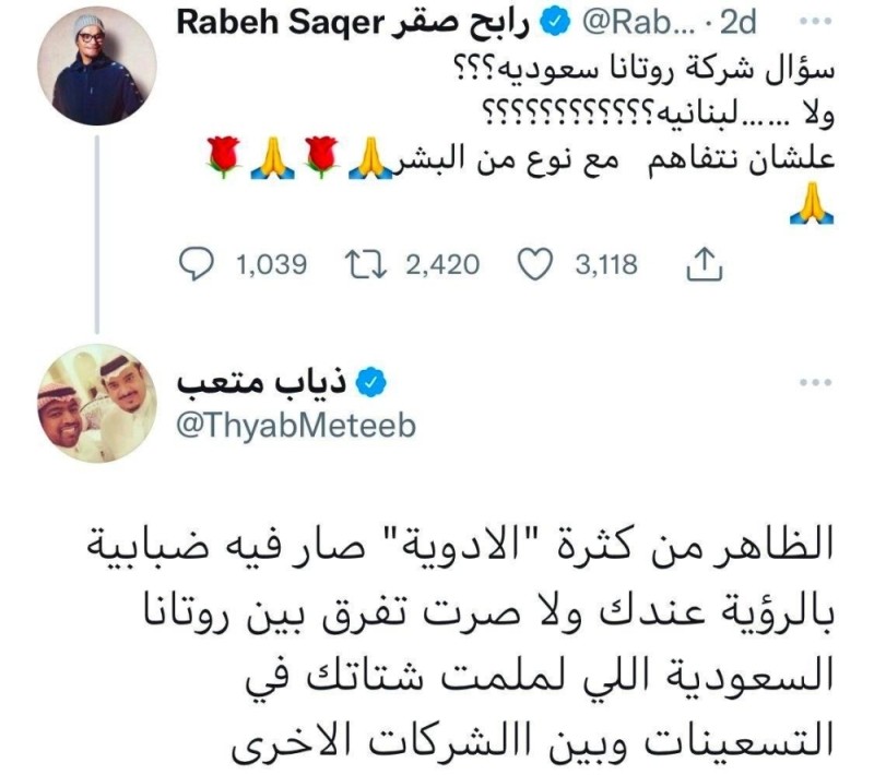 وكتب “متعب”؛ ردًا على تغريدة “صقر”: “الظاهر من كثرة الأدوية صار فيه ضبابية بالرؤية عندك ولا صرت تفرق بين روتانا السعودية اللي لملمت شتاتك في التسعينات وبين الشركات الأخرى”.