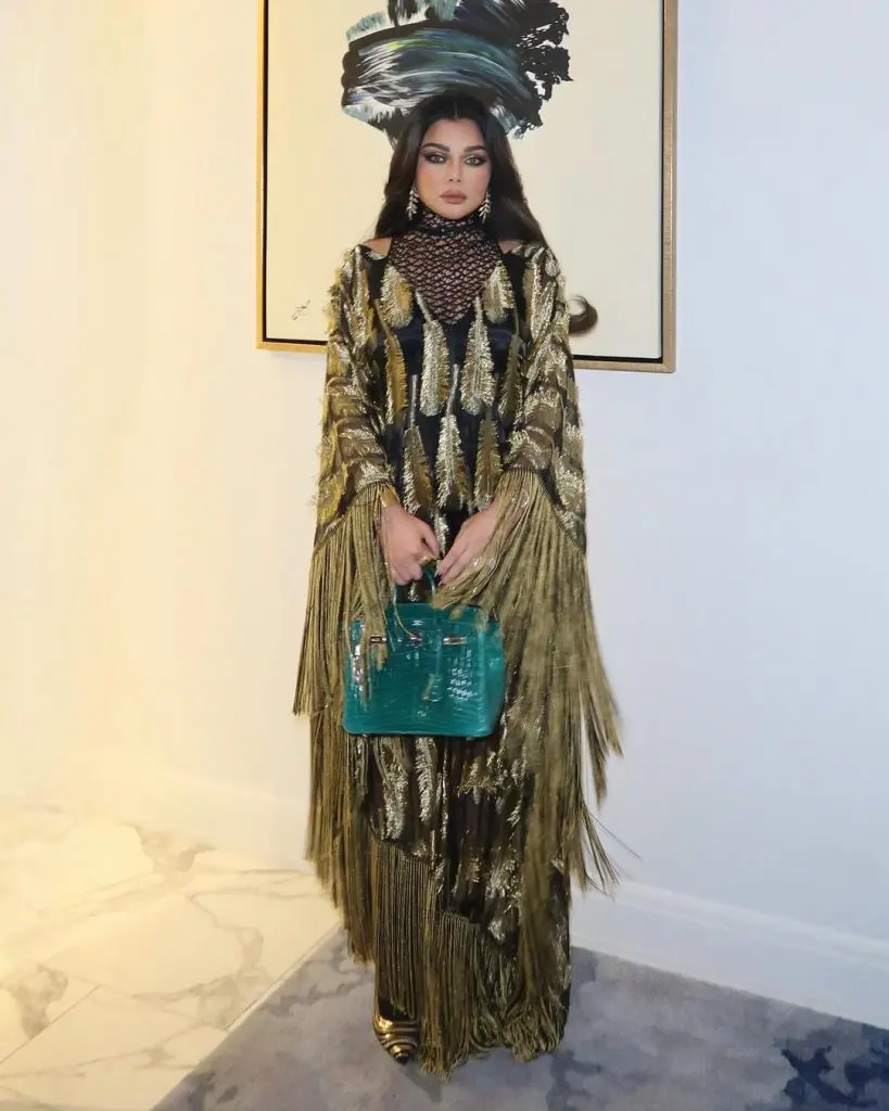 وظهرت الديفا وهبي في الصور وهي عباءة واسعة باللونين الأسود والذهبي وبأكمام طويلة تنتهي بشراشيب من نهايات الأكمام ونهايات العباءة، وقد اختارت حقيبة من الجلد اللامع باللون الأخضر القاتم.