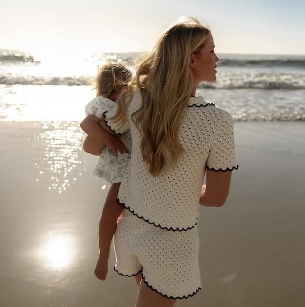 وظهرت كيتي في الصور وهي تقضي يومًا هادئًا على الشاطئ، تحمل ابنتها بين ذراعيها، حيث بدت الأجواء عائلية وعاطفية بعيدًا عن صخب الحياة العامة. وارتدت كيتي شورتًا أبيض من الكروشيه مزخرفًا بحواف وأكمام وياقة سوداء، فيما ظهرت أثينا بفستان أبيض مزخرف بنقوش البيزلي، وقد أُخفي وجهها بذراع والدتها، بينما ظهر شعرها الأشقر الطويل الذي ورثته عن والدتها.