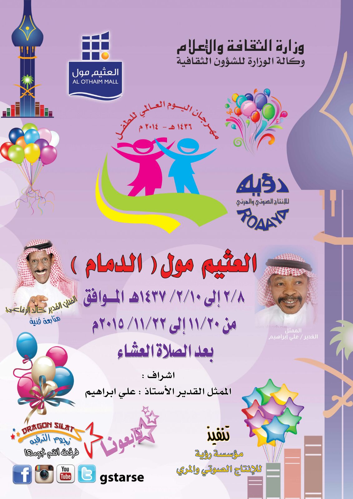 برعاية وكالة الشؤون الثقافية بوزارة الثقافه والإعلام يقام في مدينة الدمام وتحديداً في مجمع العثيم مول يوم الجمعه القادم بتاريخ 8صفر 1437 هـ الموافق 20نوفمبر 2015 م مهرجان اليوم العالمي للطفل تحت مظلة إمارة المنطقة الشرقية ، وسيتضمن البرنامج العديد من الفقرات التي تهم الطفل وأسرته مثل المسابقات والمسرحيات الخفيفه التي تهتم بالتربية والنشاءة الصالحه إلى جانب الألعاب والهدايا القيمة وبمشاركة نجوم لامعين .